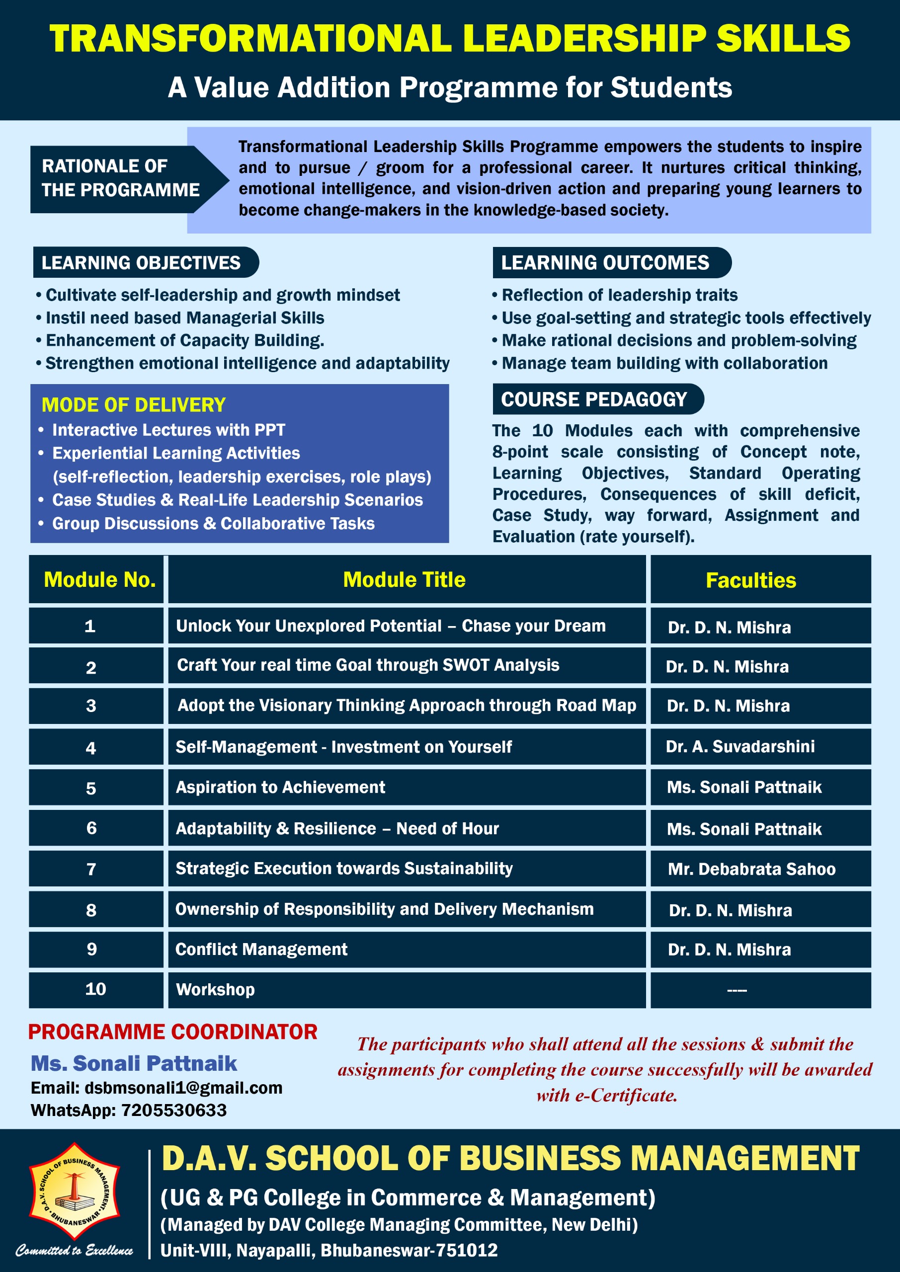 Team DSBM continues to uphold its academic legacy by fostering future-ready leaders through its value-added course, Transformational Leadership Skills. Anchored in the institute’s Quality Assurance Mechanism, this programme is thoughtfully designed to nurture vision, integrity, and adaptive leadership among learners. Through a blend of conceptual insights and practical skill-building, the course emphasizes holistic personality development and ethical decision-making.This course empowers trainees to inspire change, lead with purpose, and realize their potential for sustained personal and professional growth in an ever-evolving global environment.